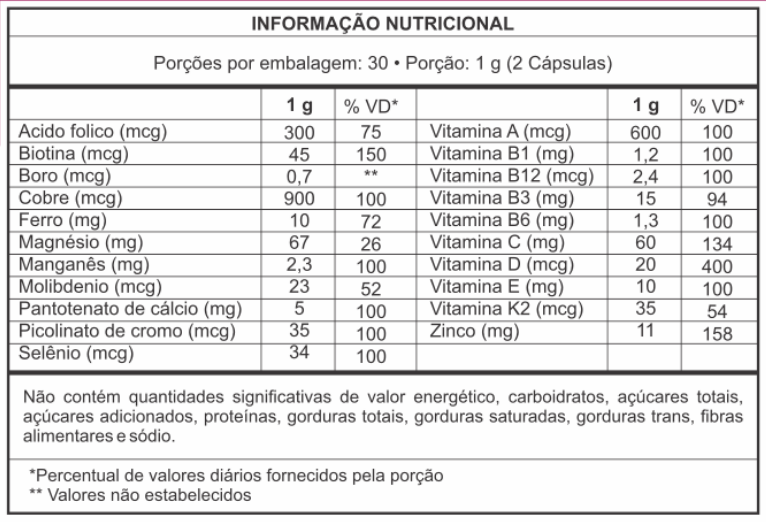 INGREDIENTES: Magnésio (bisglicinato de magnésio), Vitamina C (ácido ascórbico), Vitamina B3 (niacina), Zinco (bisglicinato de zinco), Vitamina E (acetato de tocoferol), Ferro (sulfato ferroso), Pantotenato de cálcio (ácido pantotênico), Manganês (bisglicinato de manganês), Vitamina B6 (cloridrato de piridoxina), Vitamina B1 (tiamina), Cobre (bisglicinato de cobre), Vitamina A (acetate de retinol), Ácido fólico, Vitamina B7 (biotina), Cromo (picolinato de cromo), Molibdênio (bisglicinato molibdênio), Vitamina K2 (Colecalciferol), Selênio quelato, Vitamina D3 (Colecalciferol), Vitamina B12 (cianocobalamina), Boro (boro quelato), Aerosil® (dióxido de silício) , estearato de magnésio, silicato de magnésio e celulose microcristalina, gelatina, corante rosa e água.